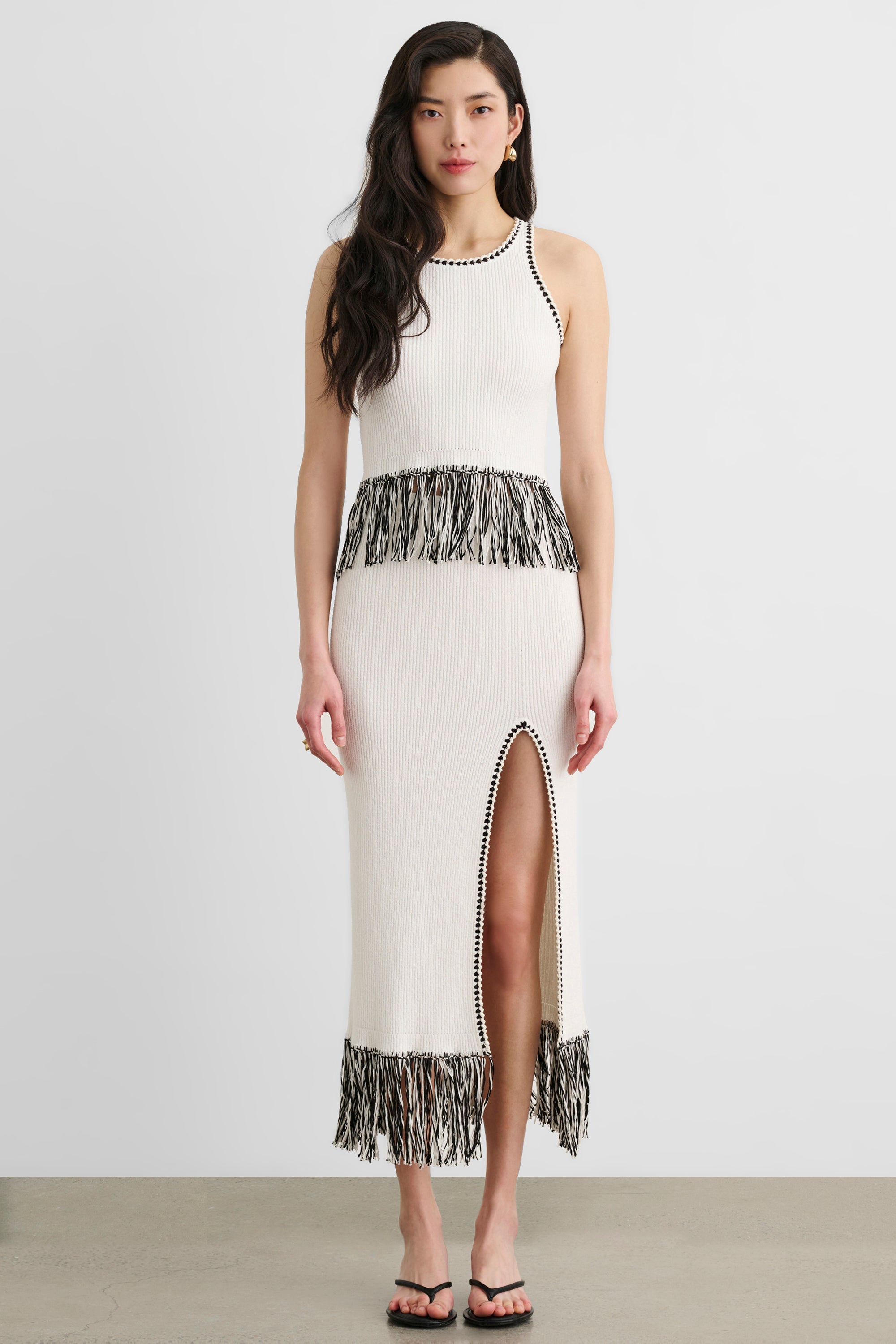 The Amora Fringe Midi Skirt With Slit is a pull-on midi skirt finished with fringe hem detailing and a front slit for statement texture and effortless movement. Style it with a fitted tank and heels for a night-out look, or pair it with an oversized blazer for a polished, modern finish.