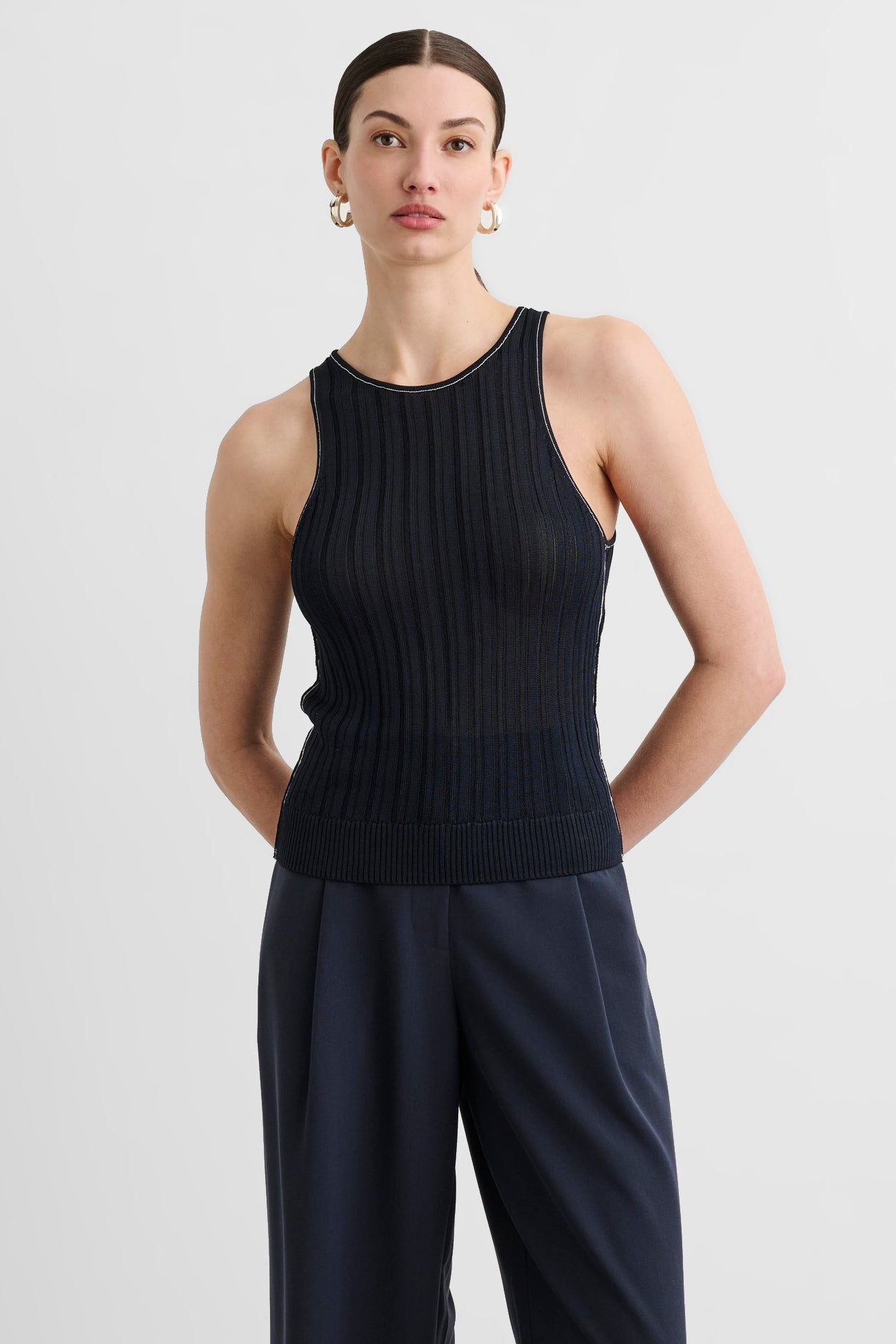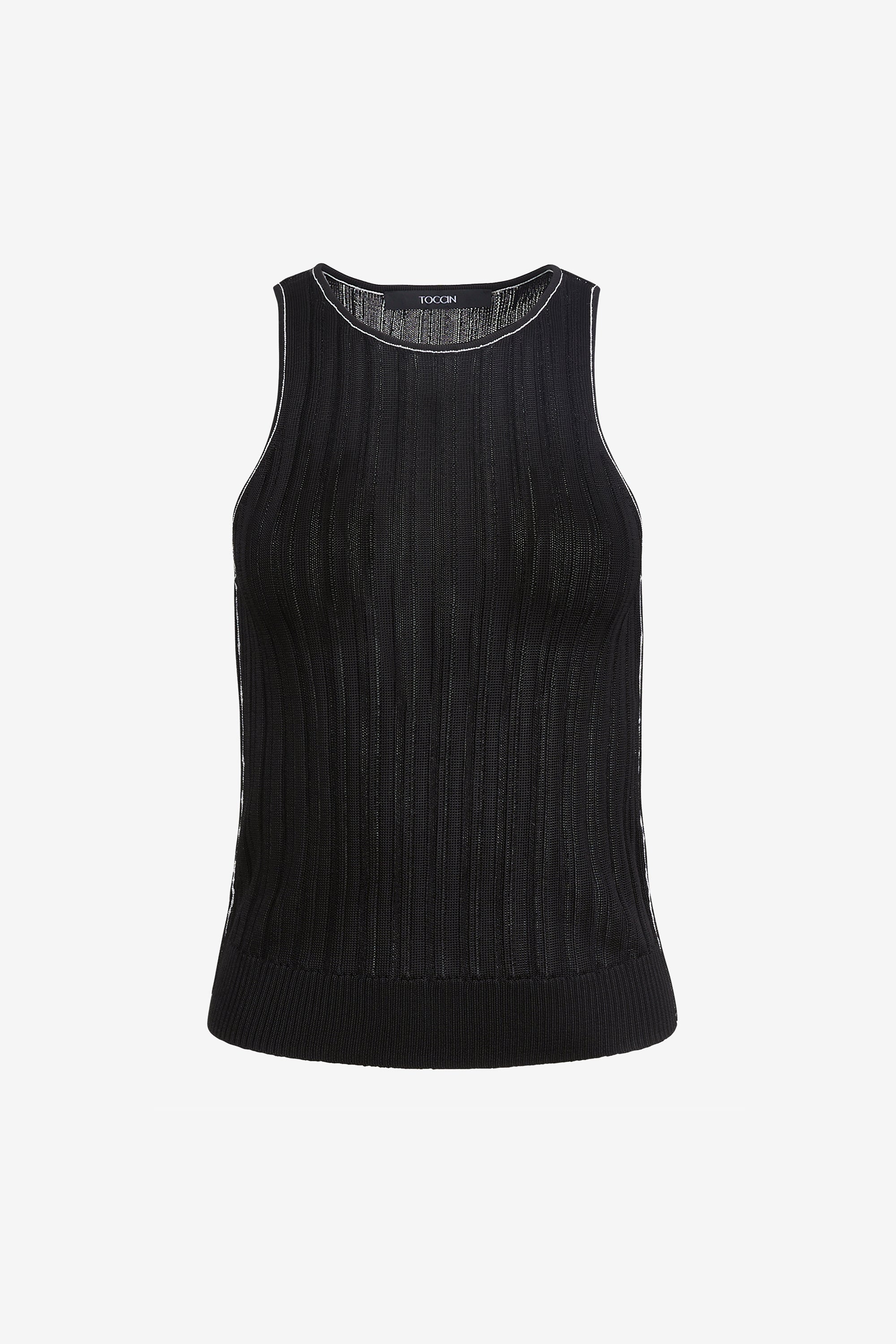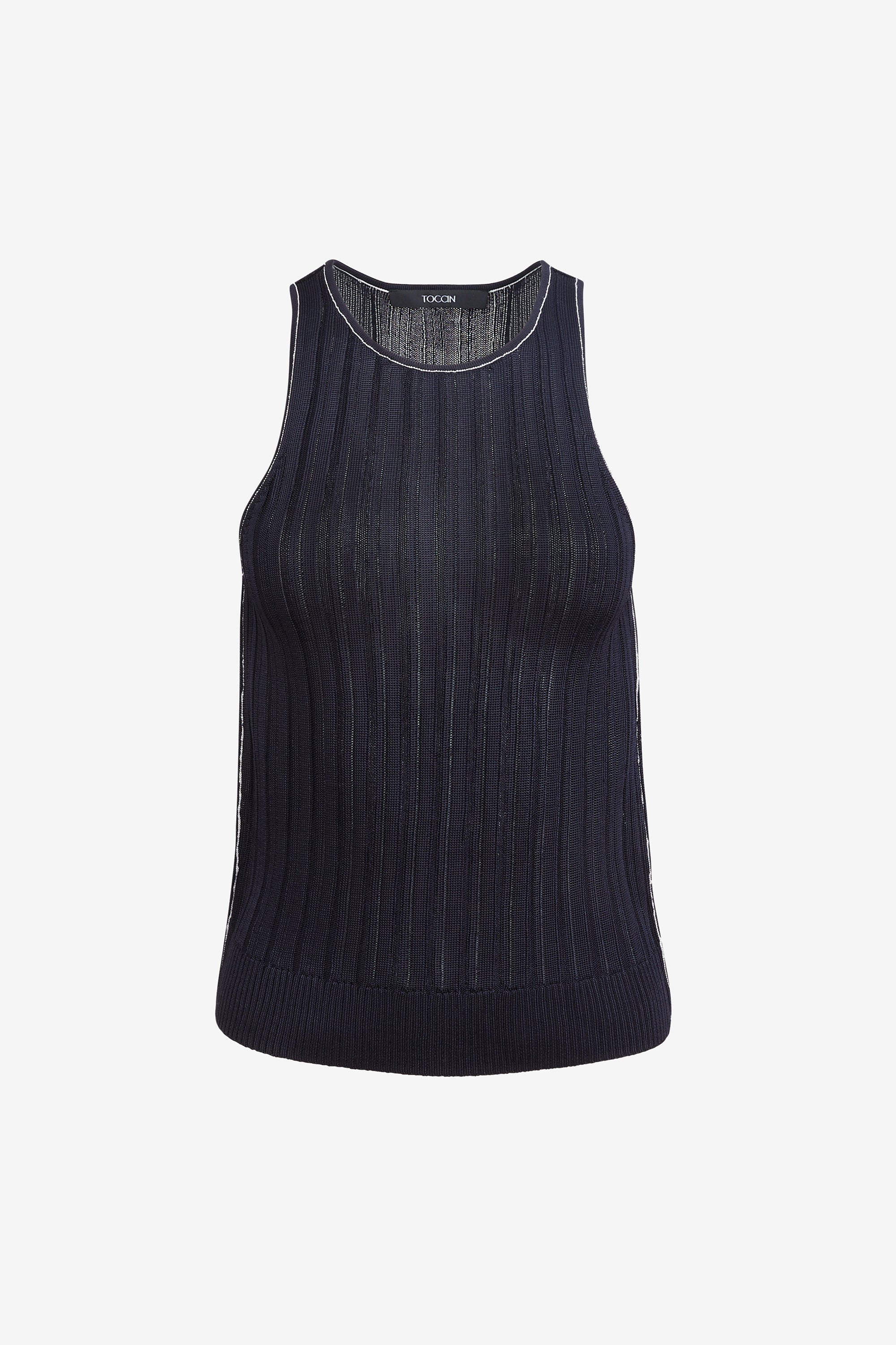 The Juniper Racer Tank is a fitted racerback tank crafted from ribbed sheer knit fabric for a sleek, second-skin feel with subtle texture. Style it with high-rise trousers and a blazer for an elevated everyday look, or wear it solo with denim for effortless off-duty polish.