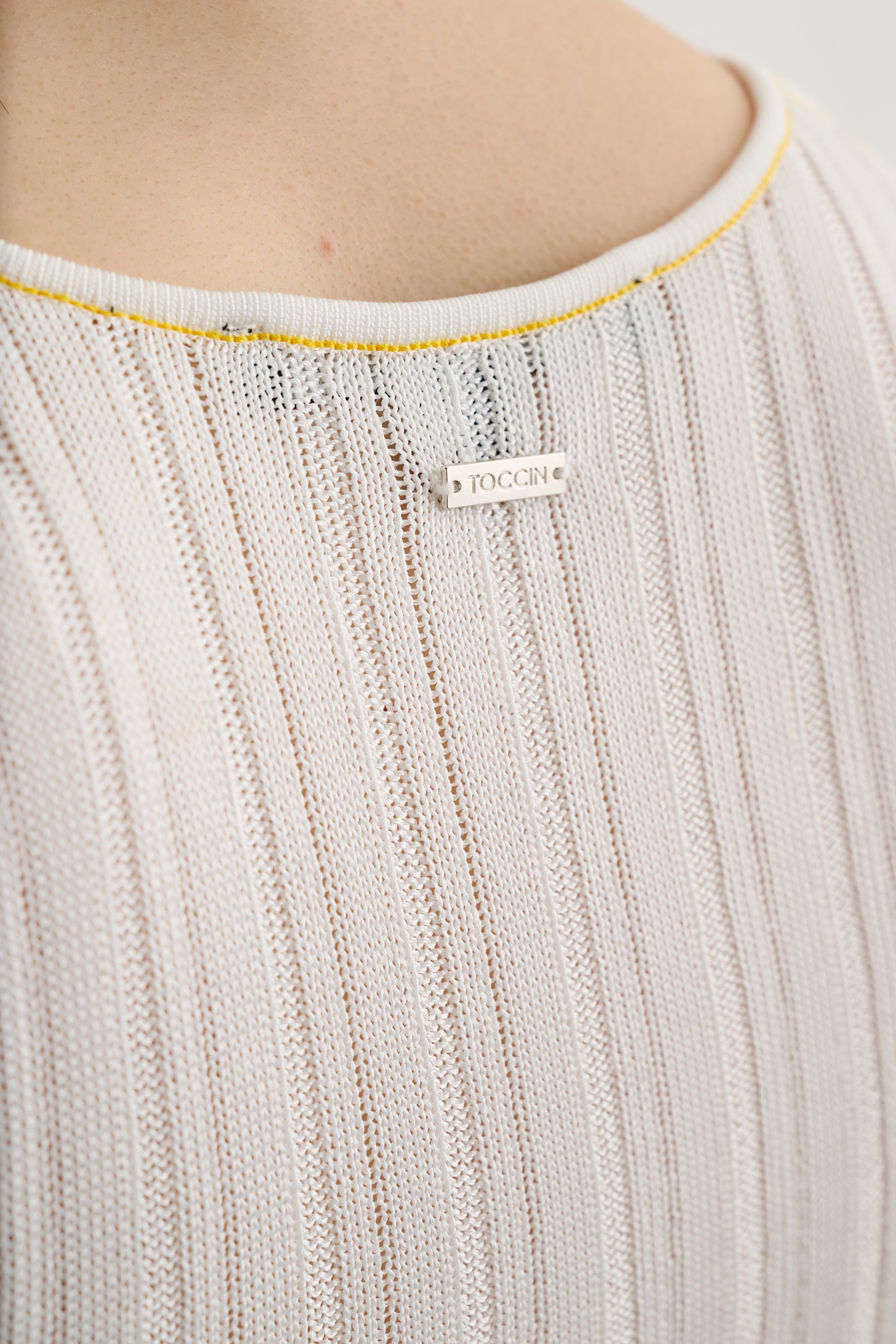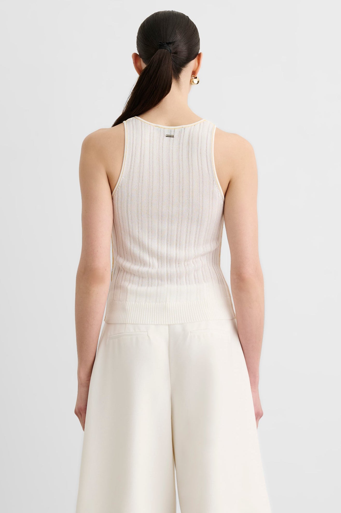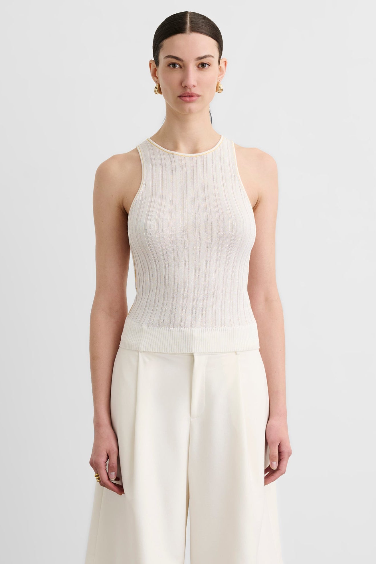 The Juniper Racer Tank is a fitted racerback tank crafted from ribbed sheer knit fabric for a sleek, second-skin feel with subtle texture. Style it with high-rise trousers and a blazer for an elevated everyday look, or wear it solo with denim for effortless off-duty polish.
