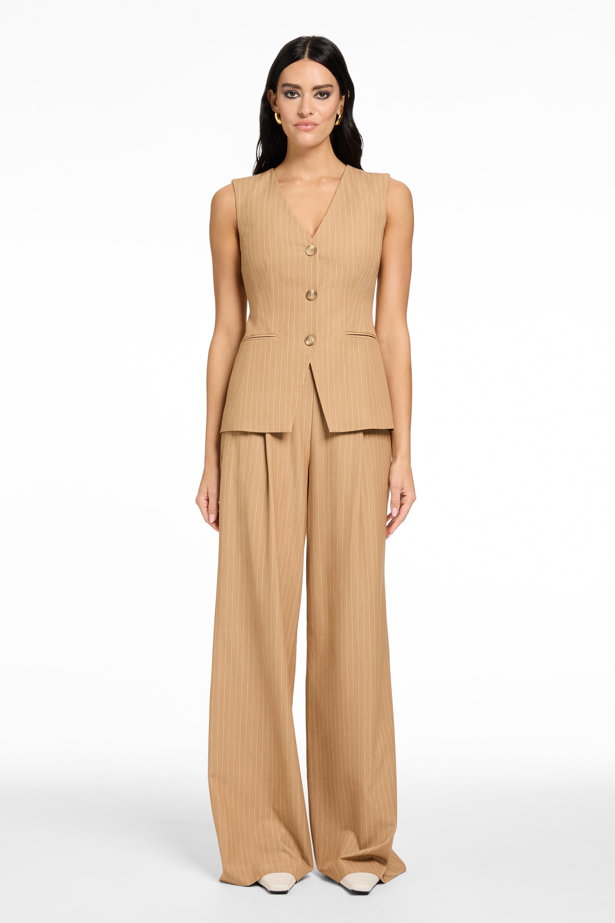 The Tibbie is a fitted, V-neck vest with a three-button front and sharp cutaway hem. Tailored for a sleek, feminine fit, it brings refined structure to any look. Style it solo for a confident statement or layered under a blazer for timeless polish.