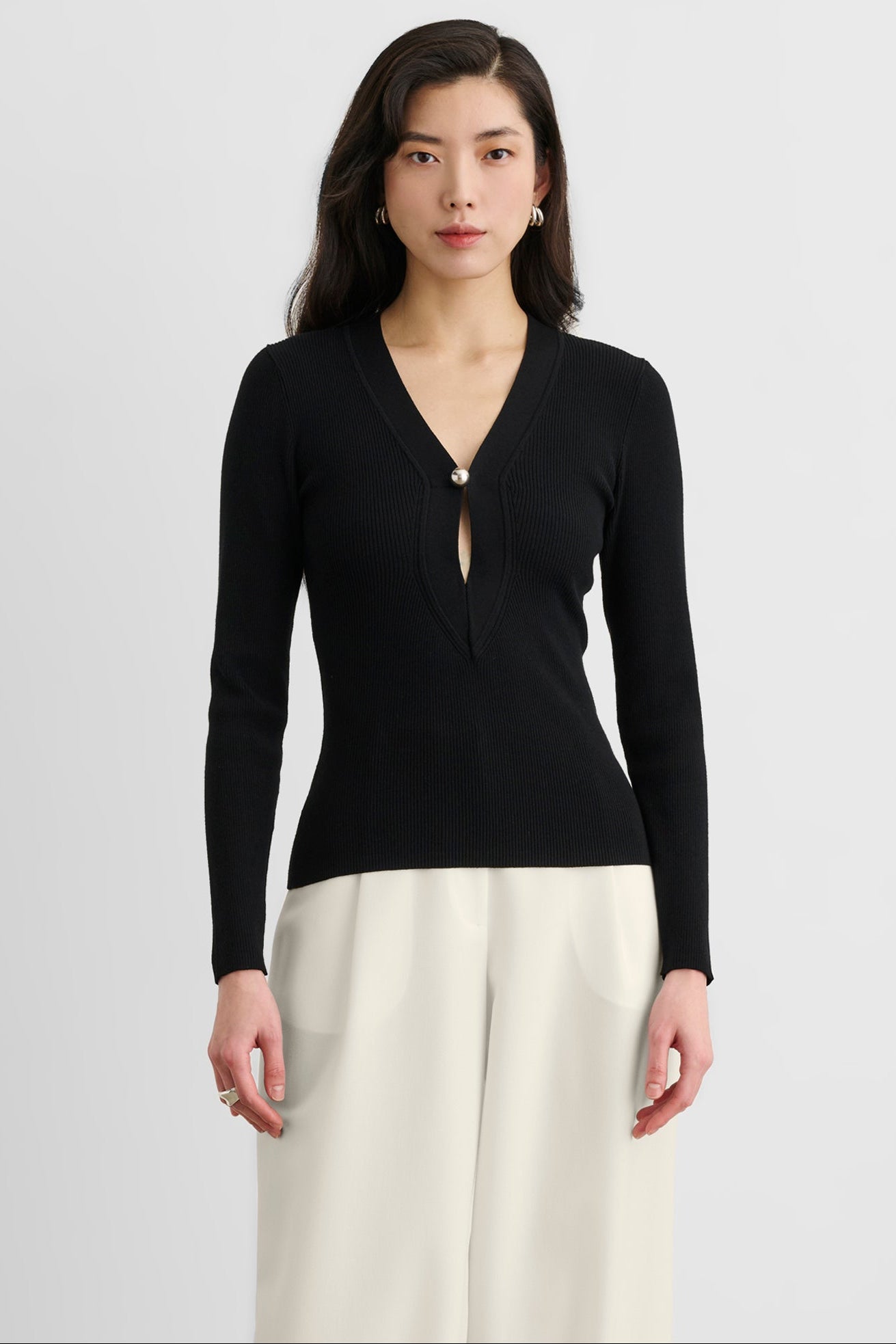 The Dion Long Sleeve Top is a fitted V-neck top with long sleeves and a keyhole cutout detail for a sleek, modern finish. Pair it with high-rise trousers and heels for an elevated night-out look, or style it with denim and a blazer for polished everyday wear.